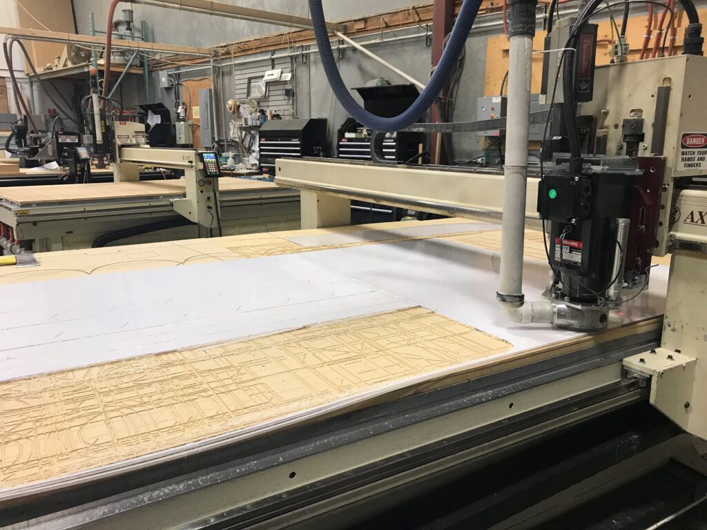 Dimension 3 Plastics utilizes five CNC Router Tables each with 3 Axis cutting capabilities. Able to cut and machine a variety of materials including wood, plastic and aluminum. Our largest table can cut up to 72” x 144” and up to 5” thick materials. Working with CAD/CAM software our Design Department creates a tool path that the CNC router will follow to produce precision parts. Production of custom goods, tooling for thermoforming molds and jigs for production are easily cut with a CNC machine. We can work with your DXF, DWG, AI, EPS, IGES, Solidworks, Inventor and AutoCad files in Vector format to produce custom logos and lettering for signage displays. Complex shapes and specific hole patterns are simple tasks for CNC, reducing production time & cost while producing higher tolerance parts than conventional equipment.